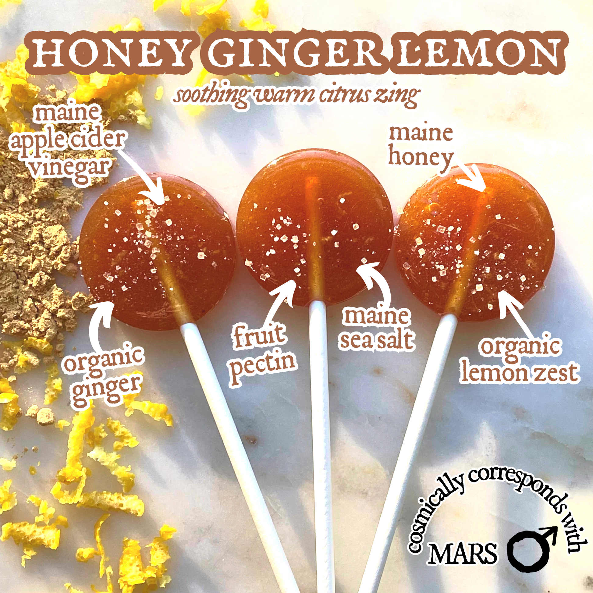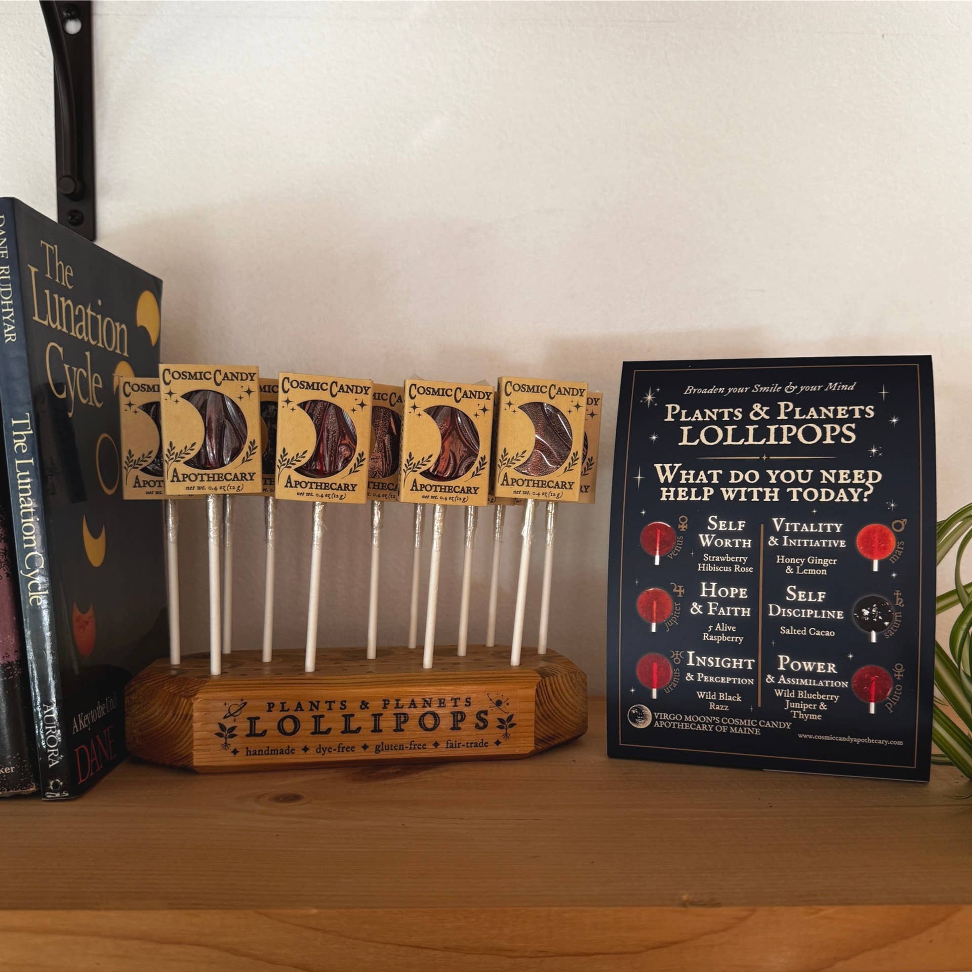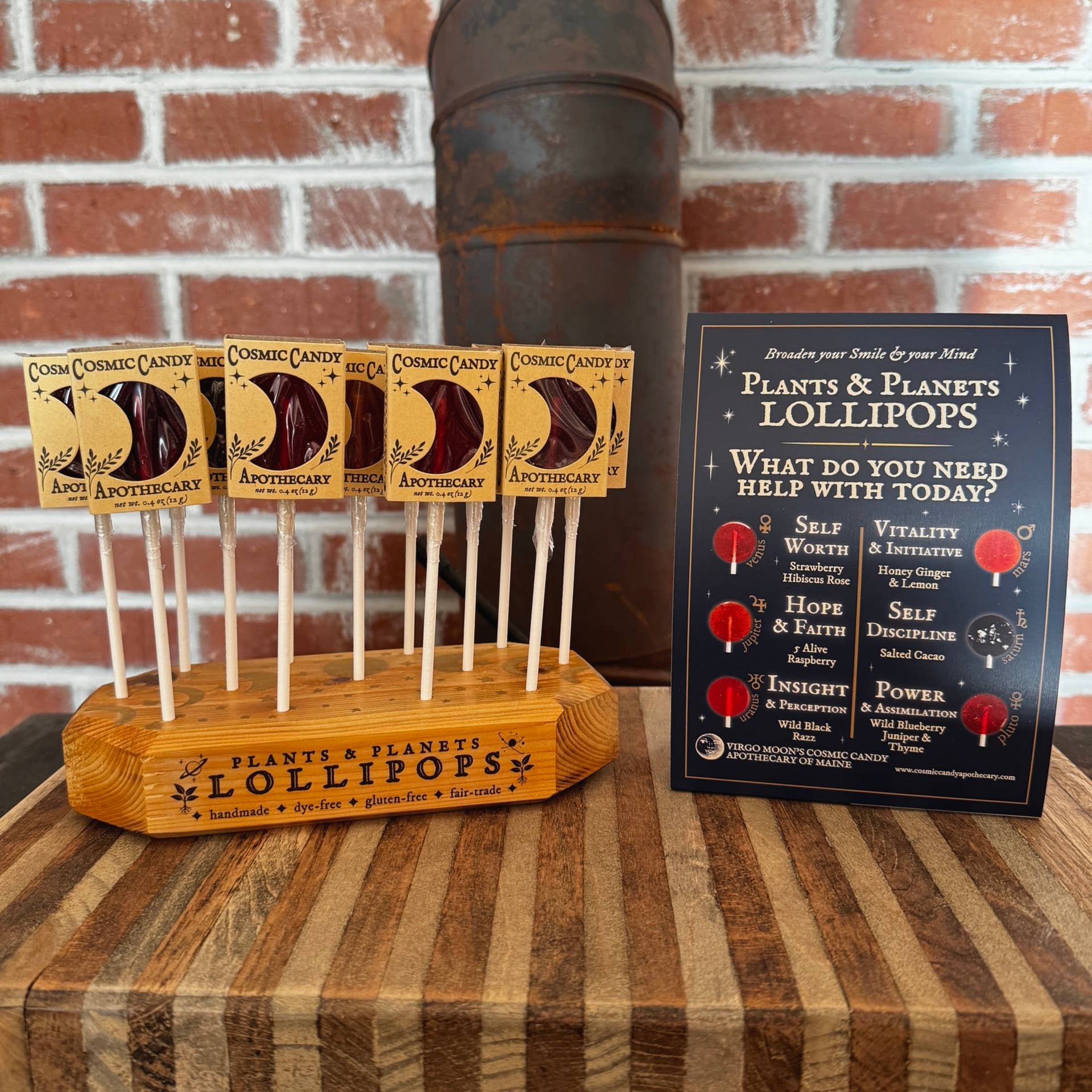 All natural lollipops, made with whole fruits, flowers, and herbs - zero food coloring - real ingredients that you can see! Most flavors are VEGAN friendly, except the Honey Ginger Lemon (honey) and Salted Cacao (butter). Naturally gluten-free. Each lollipop flavor corresponds with a planet - each lollipop is encased in a recyclable kraft sleeve that includes educational information on the corresponding planetary archetype.