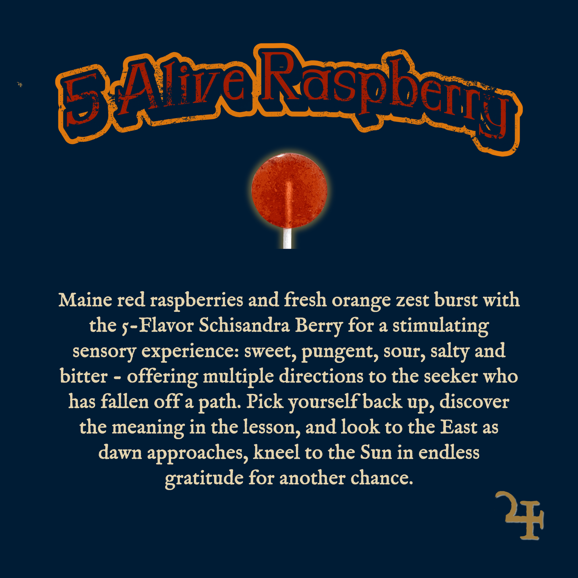 Ingredients: cane sugar*, glucose syrup, water, Maine red raspberries, schisandra berry powder, red raspberry concentrate* (Water, Organic Gum Acacia, Organic Cane Sugar, Natural Flavors, and Citric Acid), orange extract* (orange oil, alcohol,) schisandra extract (alcohol, schisandra berries), lemon juice*, citric acid, olive oil*; *organic