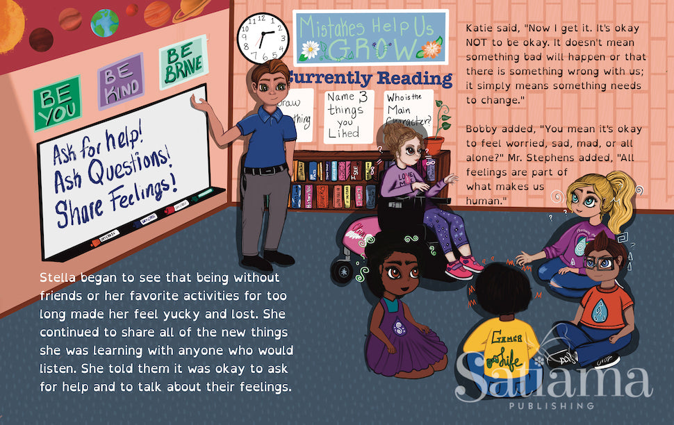 When Stella wakes up with a swirling-whirling feeling in her belly, her mom doubts there is a problem. Yet Stella’s pediatrician suggests she work with Ms. Tina, a talk therapist. Ms.Tina helps Stella understand why she has funny feelings inside, which Stella shares with her teachers, peers, and anyone who will listen! Stella starts a wave of understanding and shared experience for everyone around her, offering them supportive tools for a lifetime.